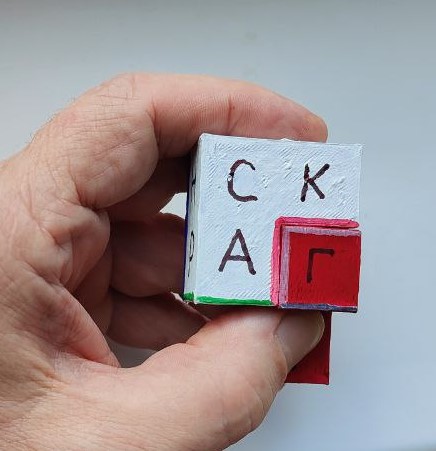 Одной из граней фигуры соответствующего цвета закройте пустые клетки. Прочтите слово из шести букв по часовой стрелке Подсказка №2 для всех (8 минут) Первое слово: СКАмья Буквы АСК с одной из граней фигуры зелёного цвета, как на картинке